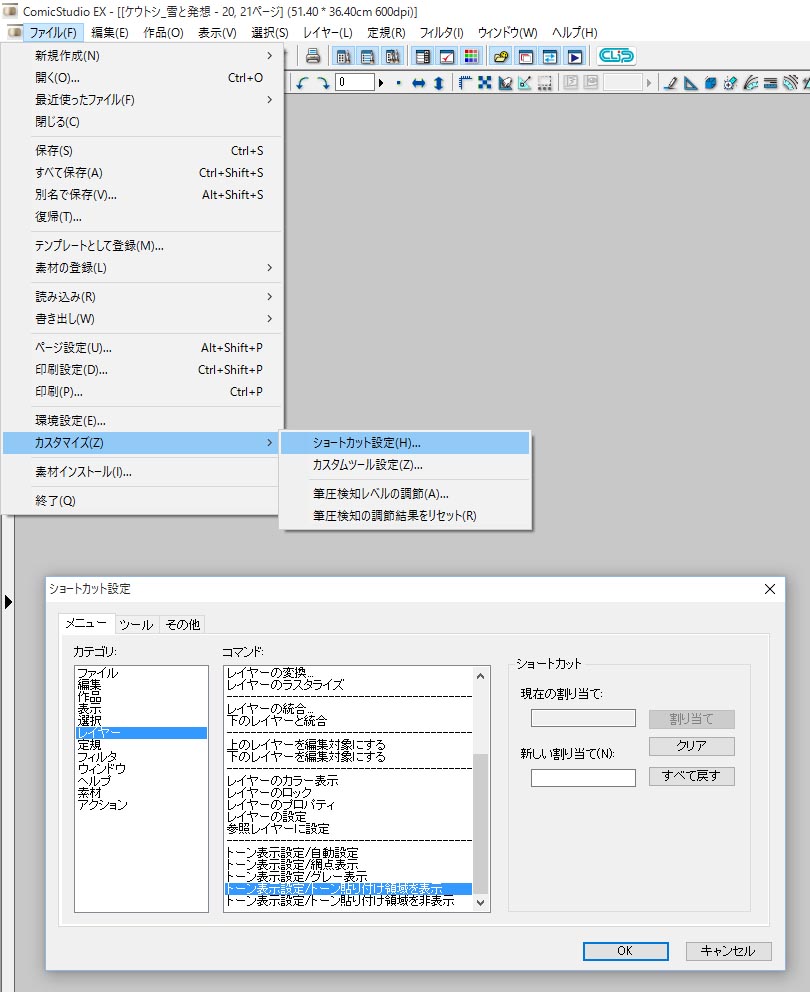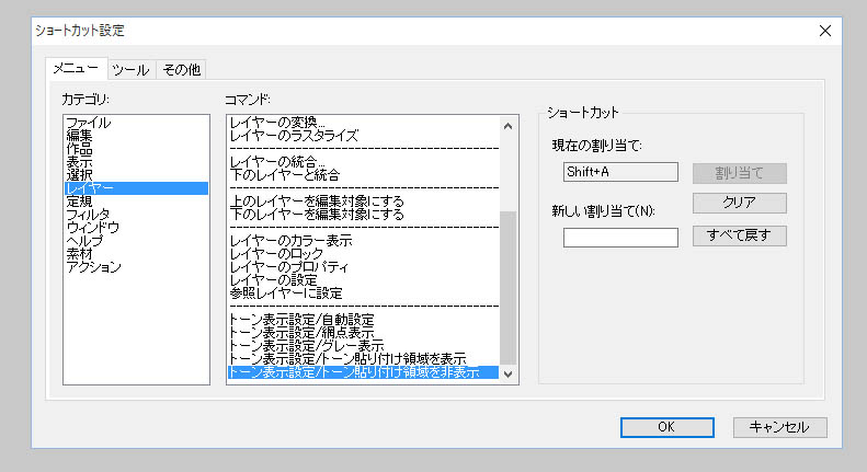 ファイル→カスタマイズ→ショートカット設定→メニュー→レイヤートーン表示設定/トーン貼り付け領域を表示